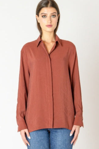 This on-trend Terracotta colored blouse features a button-back detail that will set you apart from the crowd! Crafted from a relaxed and comfortable fabric blend, it's the perfect colorway for your favorite Fall outfits. Try it under a blazer, layered with a sweater, or on its own with comfortable denim. Any way you style it, Lydia will be in your rotation of avorites this season!