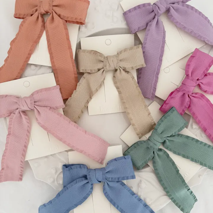 Say hello to your new favorite hair candy! These sweet ruffle-edge bows come in the dreamiest rainbow of shades — from petal pink and lilac to sky blue and soft sage. Made with textured grosgrain ribbon and finished with playful frill edges, each bow brings the perfect splash of color to any outfit.