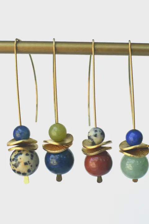 Delicate as they are fierce. These cuties feature a playful combo of gemstone beads with organic wavy disc accents on raw brass ear wires. Earrings are 2" long and made with nickel and lead free brass.