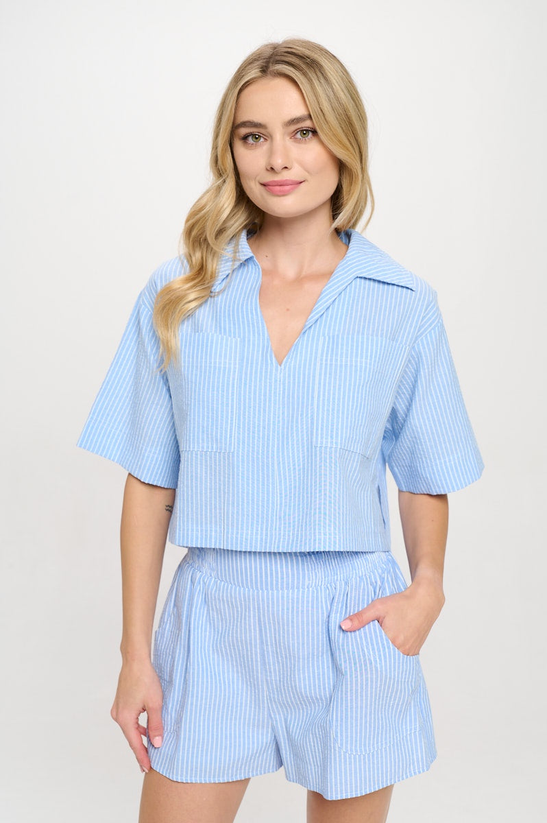 Featuring an open collar neckline, and boxy, slightly cropped silhouette, the Cerulean striped top is perfect paired with the coordinating shorts (sold separately), or with your white linen pants and jeans! This airy top is easy to style from day to night & will keep you comfortable and cool while you're on the go!
