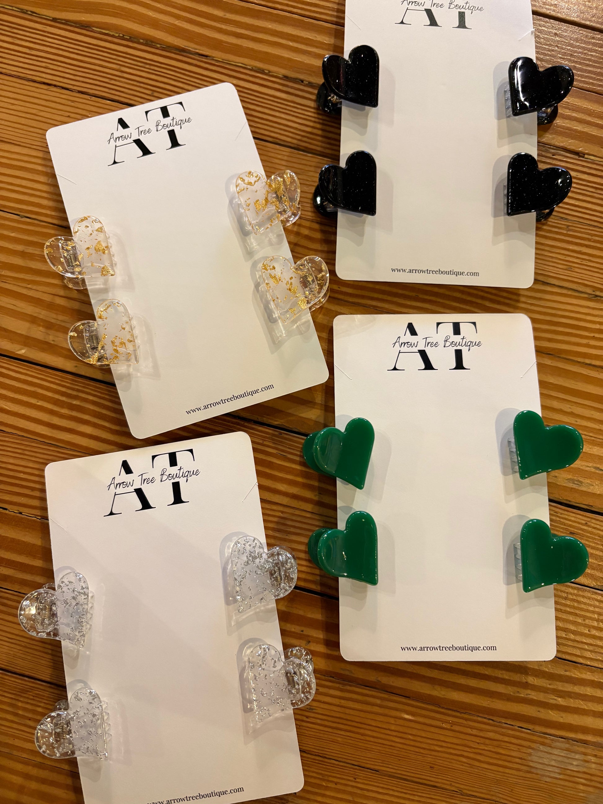 These mini heart claw clips come in a set of 4 for easy styling— perfect for gifting or for yourself! Choose from sparkly glitter, glossy green, classic black, or clear silver to add a fun pop to any hairstyle.