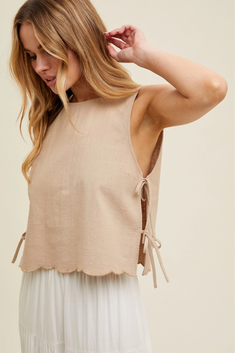 Experience effortless comfort with this adorable tank featuring stylish side ties & a scallop hem detail. Made from breathable cotton, it offers a lightweight, breathable fit perfect for spring and summer. Its sleeveless design and relaxed silhouette make it an easy, casual choice for everyday wear, keeping you cool and comfortable all season long.