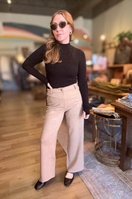 Elevate your wardrobe with these beige faux suede pants, featuring a flattering wide leg silhouette that offers both comfort and style. Designed with practical back pockets and belt loops, they provide versatility for accessorizing and everyday wear. Perfect for adding a sophisticated yet relaxed touch to any outfit.